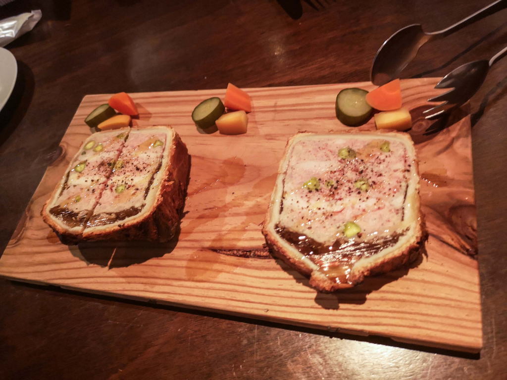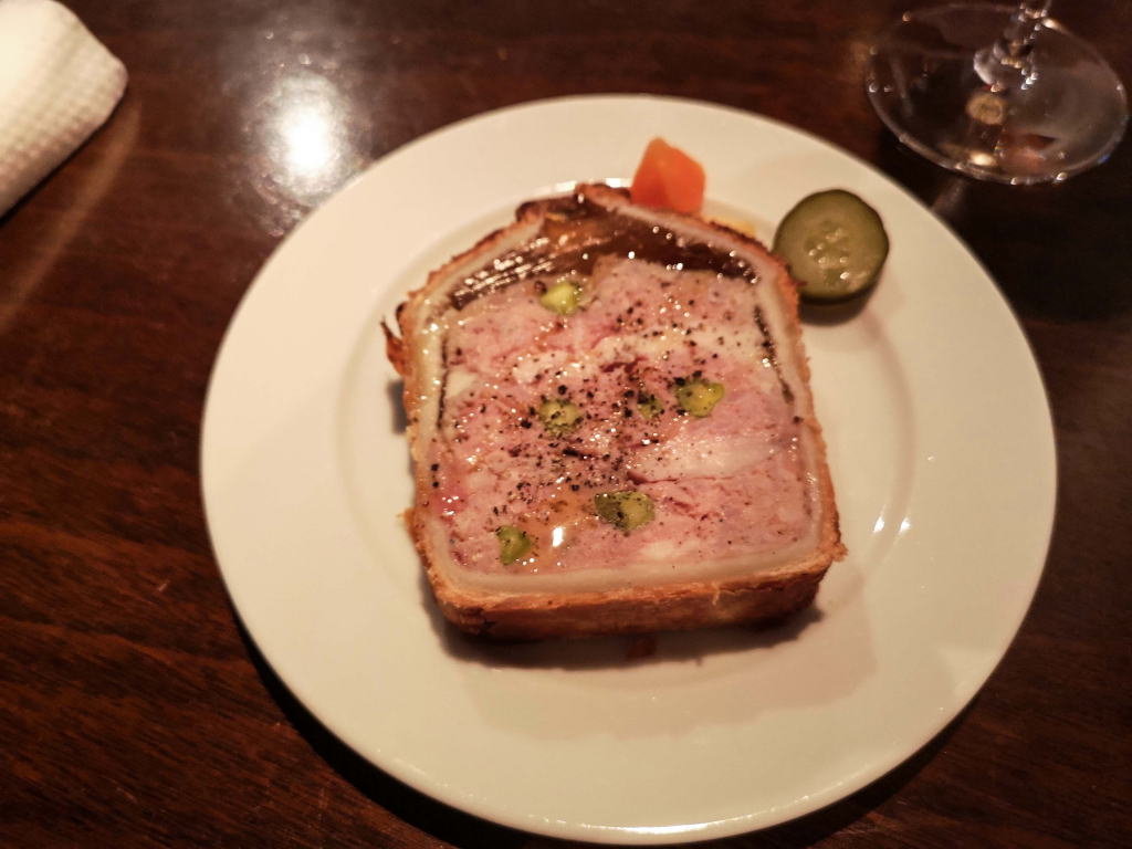 まず、このお店のスペシャリテの「パテアンクルート」です。鶏肉、豚肉のパテをパイ生地で包んだもの。周りのパイ生地のサクッとした歯ごたえと、パテの旨みのバランスが良いです。