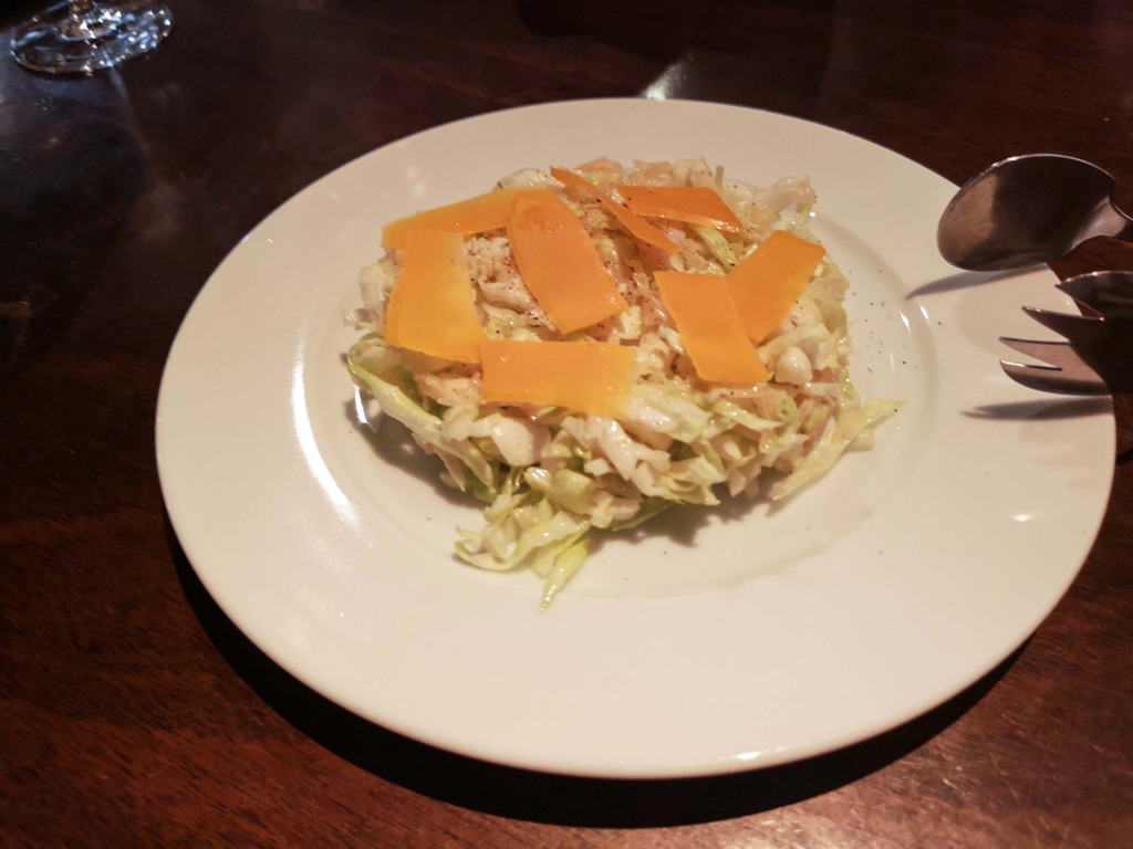 続いてザワークラウトを使ったサラダ。上に乗っているのはミモレットチーズ。