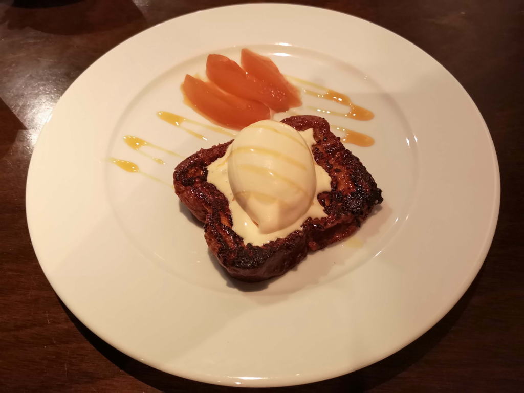 デザート。ブリオッシュ ア・ラ・ビエール。ビール風味のフレンチトースト。初めての味。大人な感じのフレンチトーストですね。