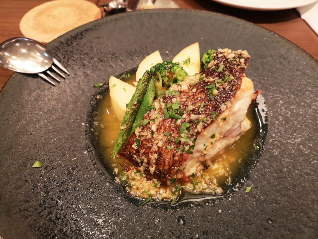 ヒラメのグリル。大きなヒラメが香ばしくローストされています。