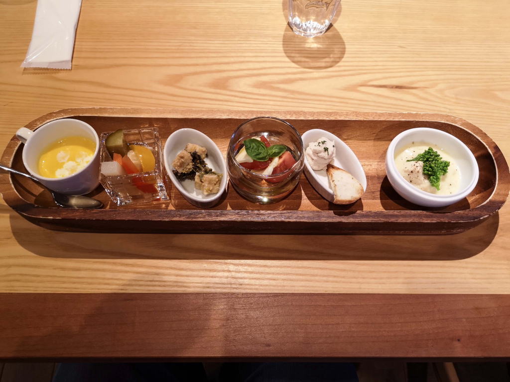 まずは、アンティパストです。小鉢が6品、スープからサラダ系、ペーストまで色とりどり。美味しいです。