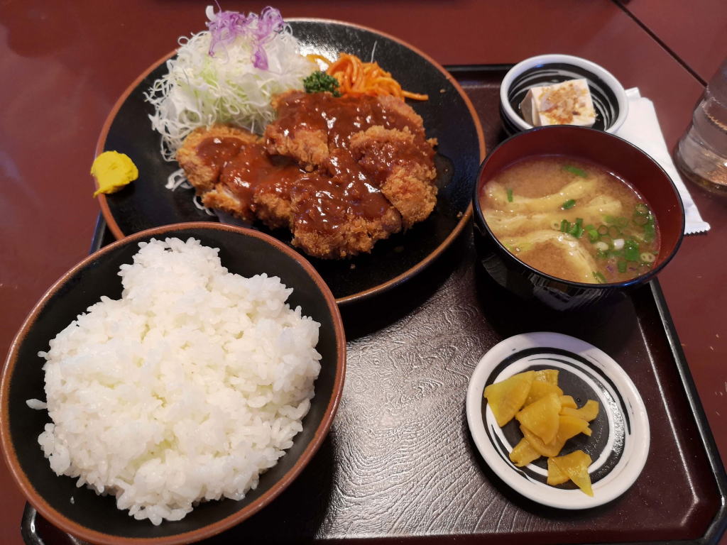 昼時とあって、少し待ちましたが、料理が登場。おお!ボリューム満点。大きなヒレカツが3枚も乗っています。