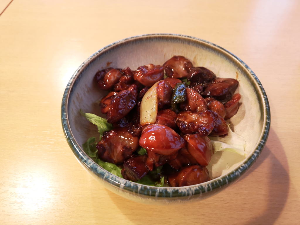 ハツの部分はコリコリしていて美味しい。レバーもねっとりとしていて美味しいです。味付けは結構濃いめですね。