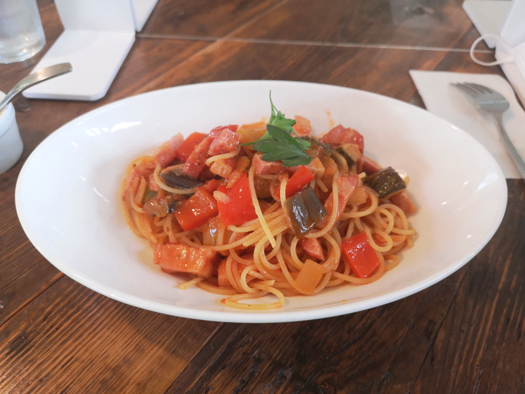 今日はいろいろ野菜のトマトソースパスタを頂きました。