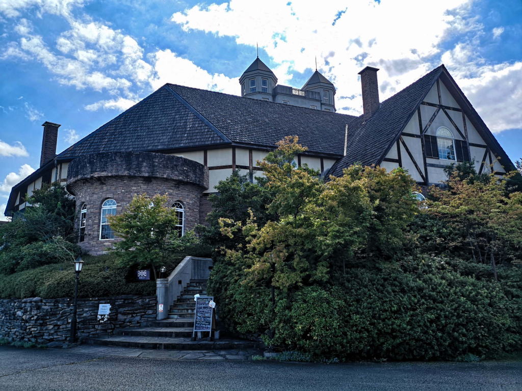 本当にイギリスのお城という感じの建物です。奥に立派な塔が見えます。