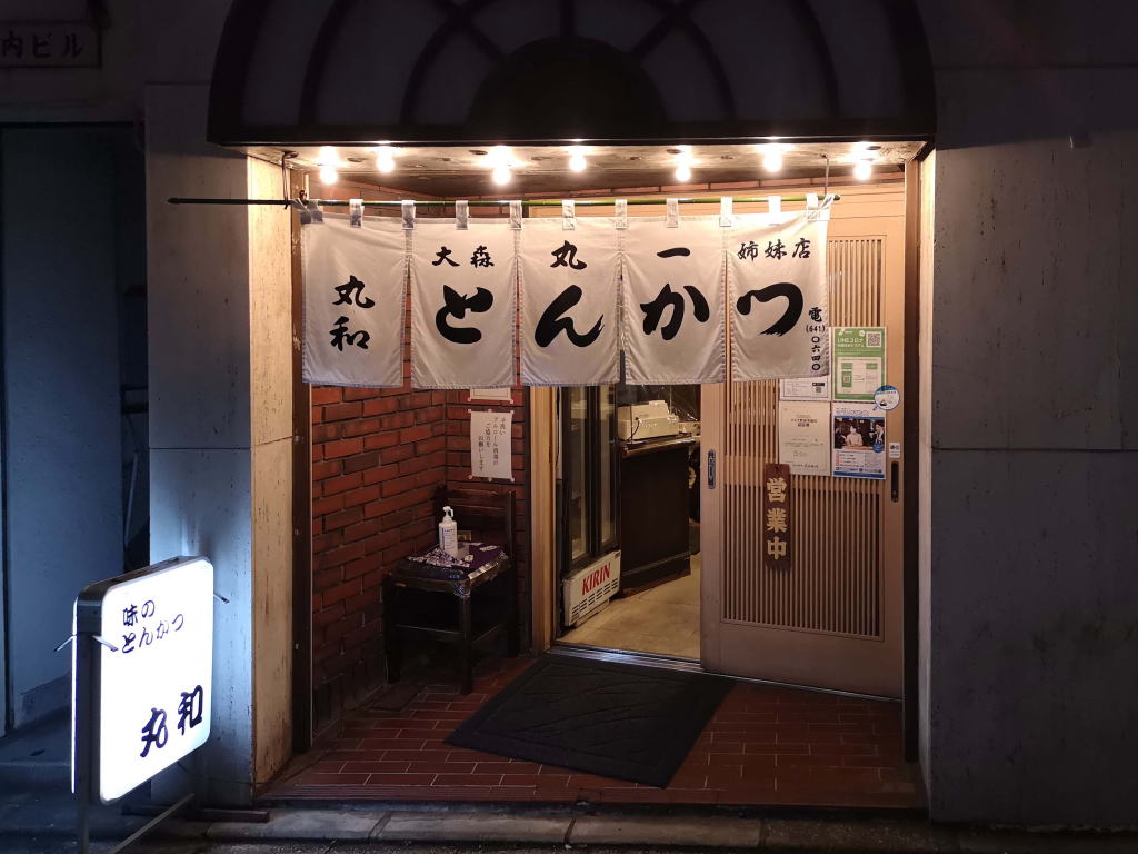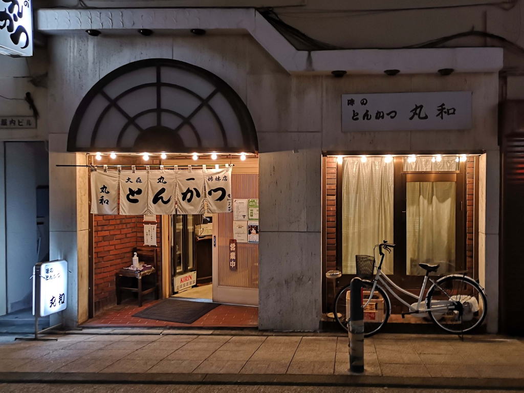 今日は、馬車道から一本裏に入ったところにあるトンカツの人気店「丸和」で夕食です。