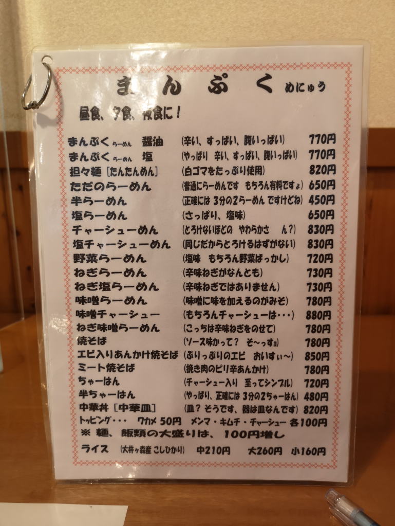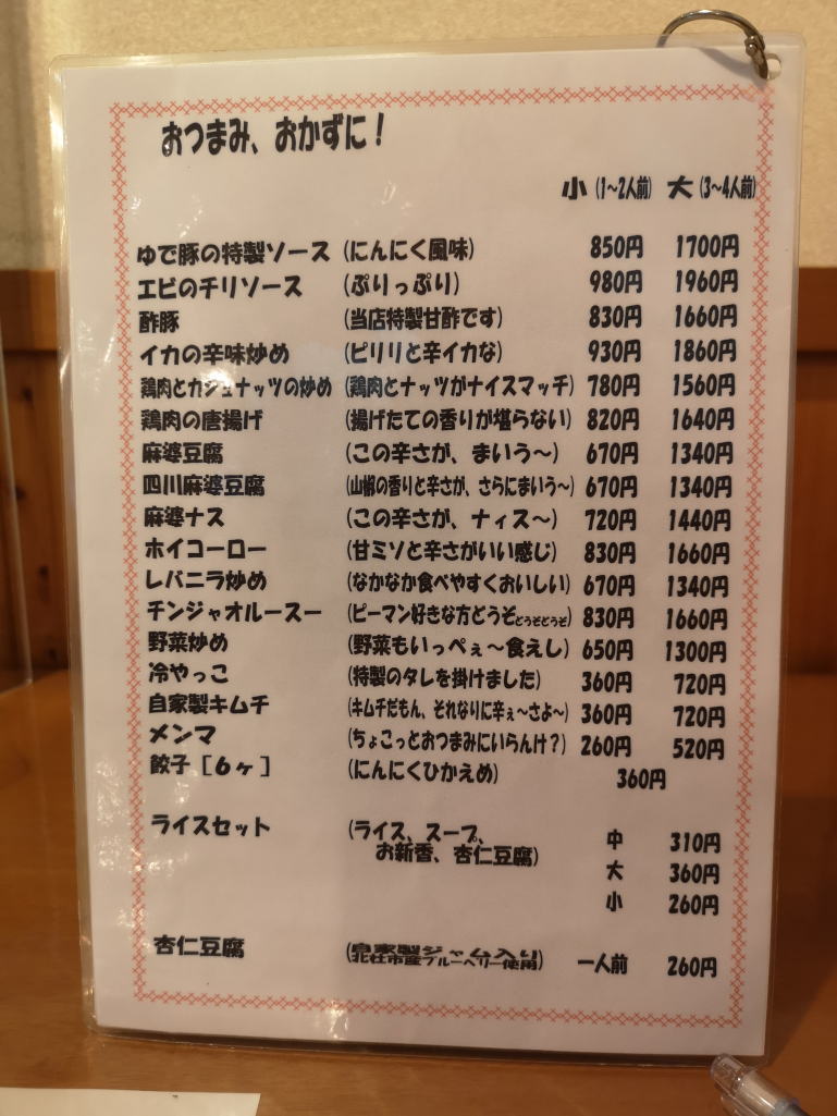 メニューは、ラーメン店としてのメニューの他に、中華料理店としての一品料理もあります。