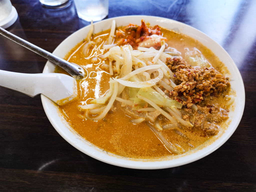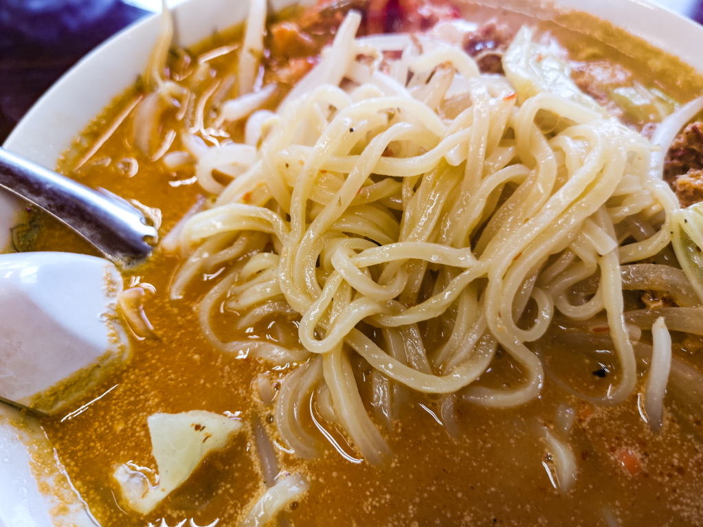 具材には、ひき肉、もやしは普通ですね。それに、玉ねぎ、キャベツが入っています。むっ?これはタンメンの具材と一緒?これで塩味のスープだったらタンメンが出来そう。そういえば、太目の麺もタンメンの麺だと思えば普通かも。でもコシは欲しいよね。