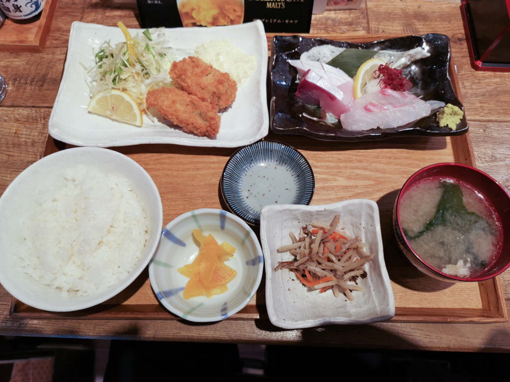 魚魚一定食は、牡蠣フライと刺身のセットです。