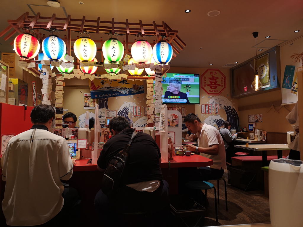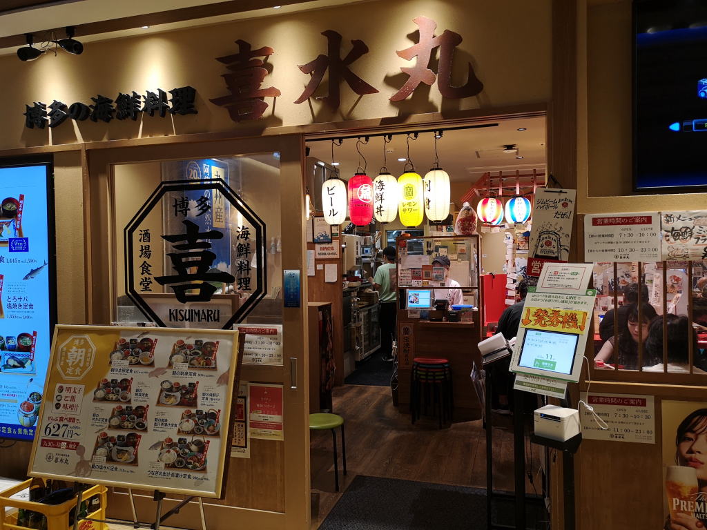 博多駅の地下1階にはレストラン街があります。その中の人気店「喜水丸」で朝食を頂きました。ここが人気なのは知っていましたが、いざ伺ってみると何と11組待ち。それでもせっかくなので、待つことにしました。20分程待ってやっと店内へ。オーダーは液晶画面で行います。私は「朝の刺身定食」をオーダーしました。ここは明太子が食べ放題。それに御飯も味噌汁もお代わり自由という大食いの人には天国のようなお店です。並んでいるひとが多いのもうなずけます。