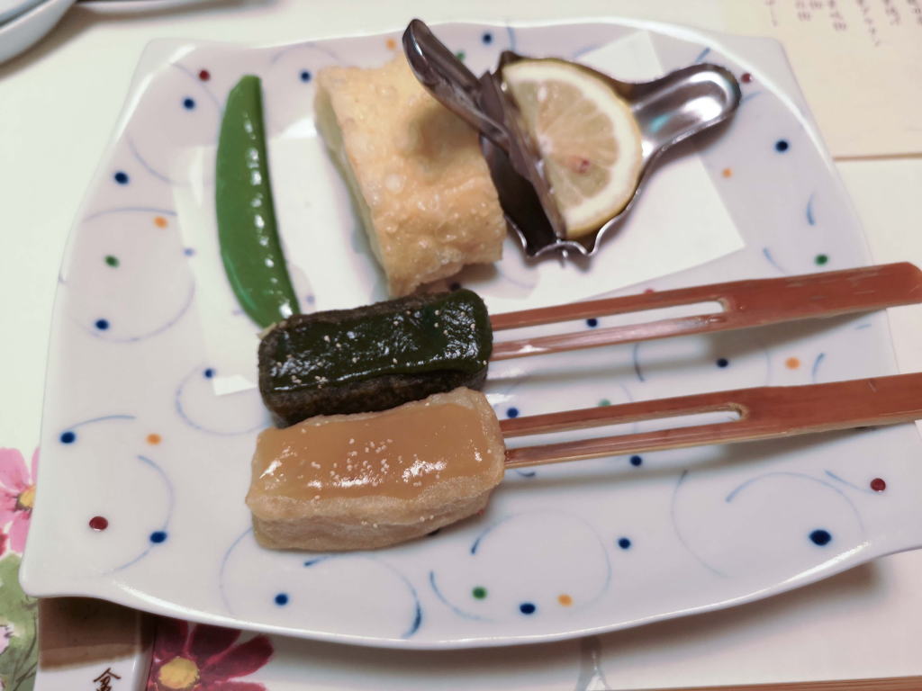 生麩はもっちりした歯ごたえに味噌が美味しいです。湯葉揚げは周りがパリッと揚がっていて香ばしくて美味しい。