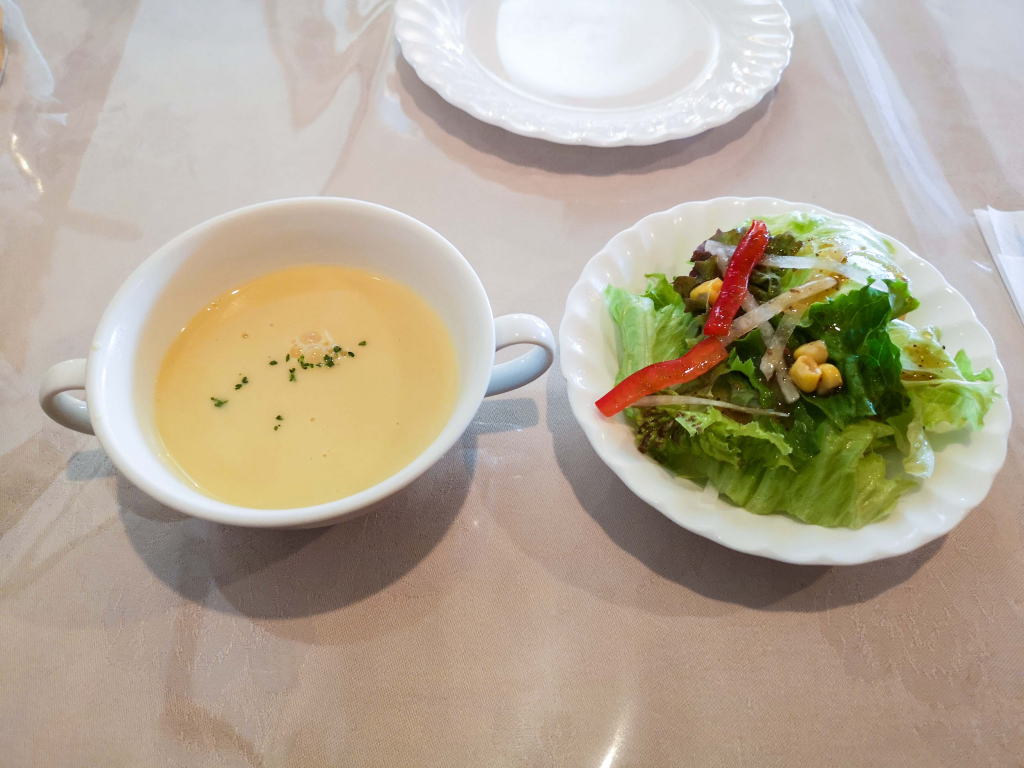 まずコーンスープとサラダが出てきました。ランチメニューだけはスープとサラダが付いているようです。