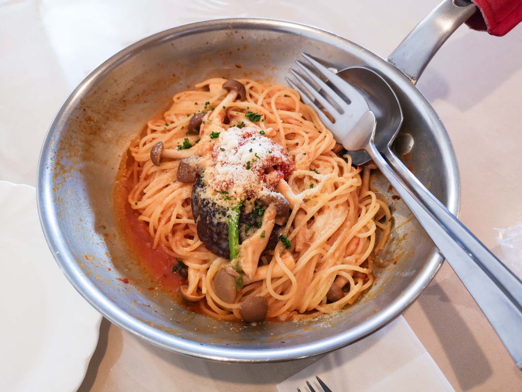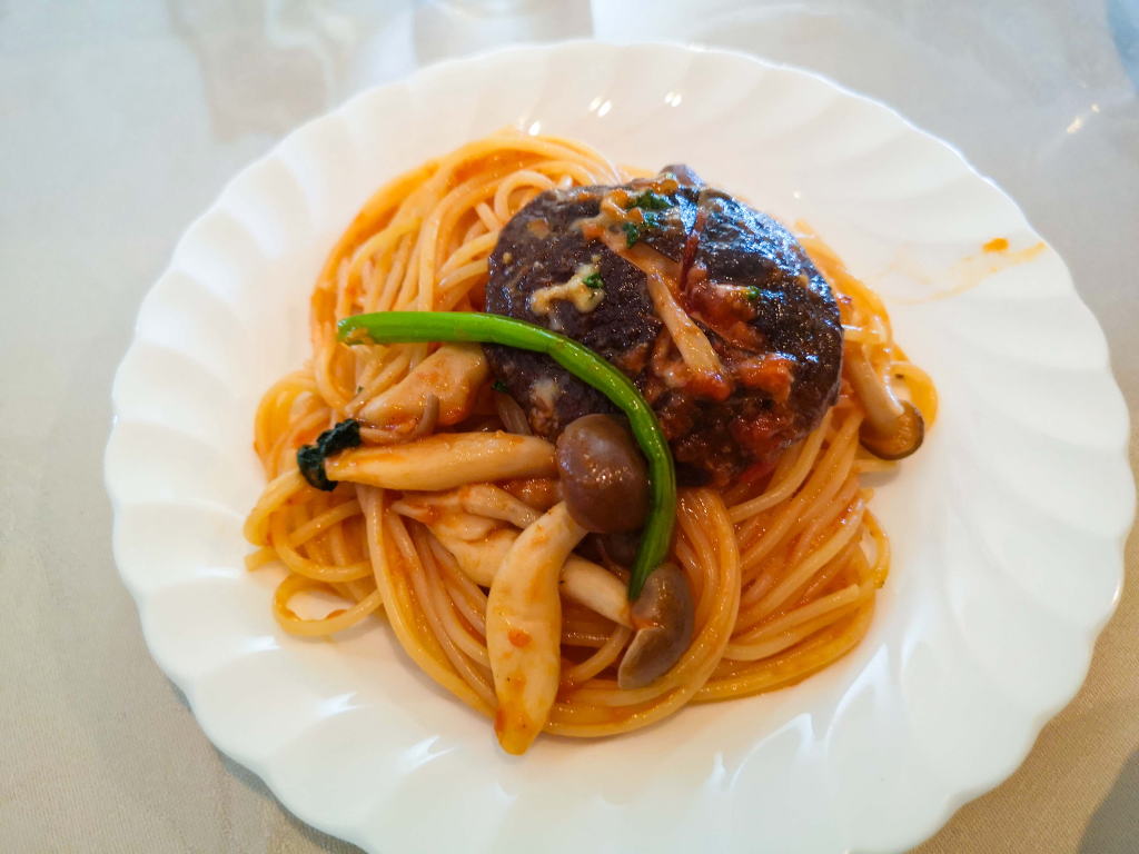 今日はボスカイオーラですね。キノコとトマトソースのパスタです。