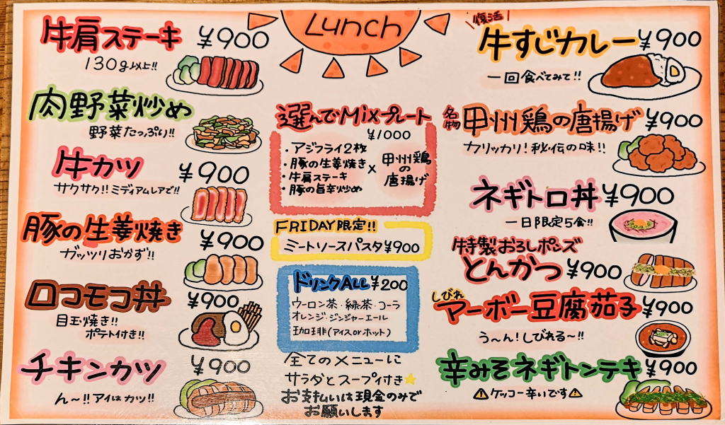 メニューはあまりジャンルに決まりはなく、色々な料理が選べるようです。