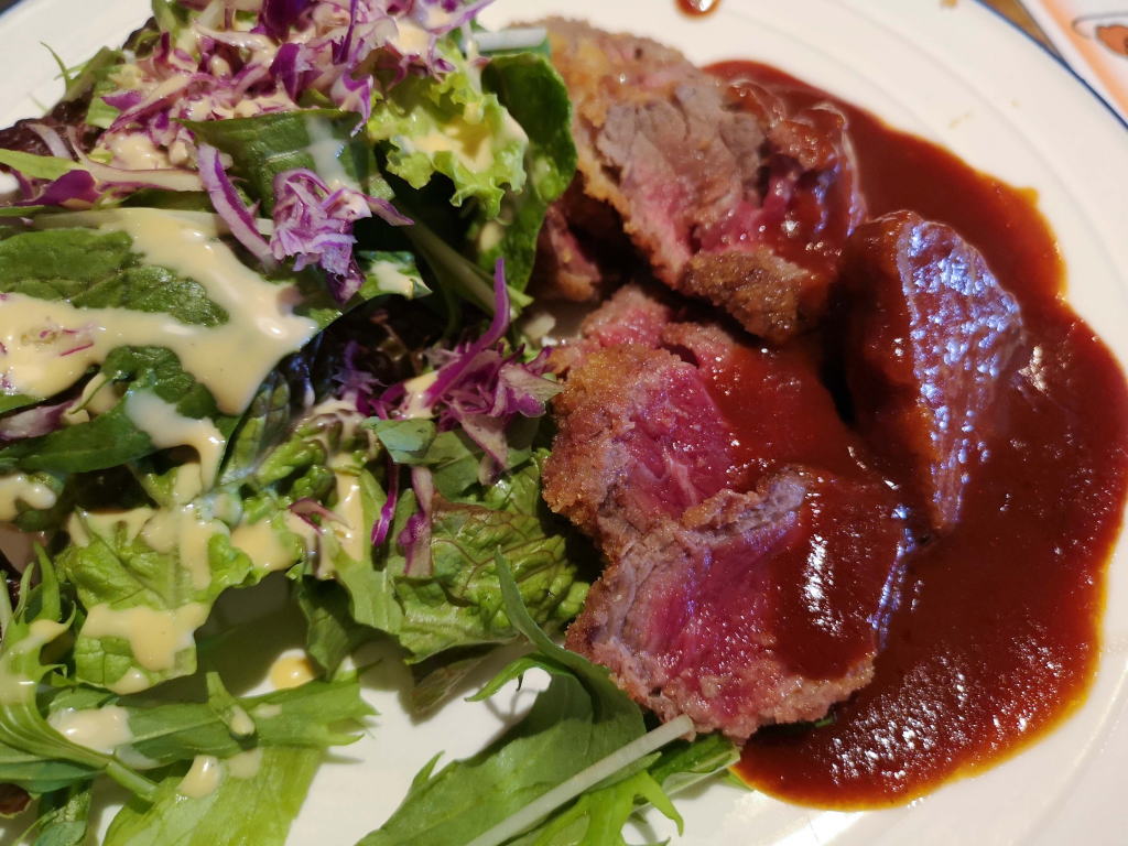 さて、牛カツ登場。おぉ、レアな牛カツです。