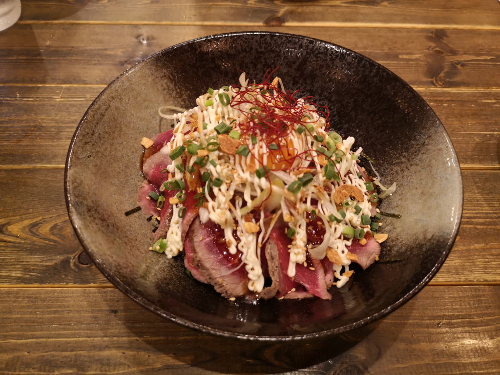 ご飯の上に牛肉のタタキ。その上に野菜が乗ってマヨネーズが掛かっています。