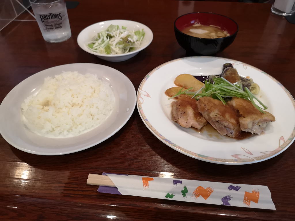 程なくしてAランチ登場。値段からは想像できないしっかりとした料理ですね。鶏肉も柔らかく、ポン酢でさっぱりと頂けます。それに茄子のソテーも付いていて、嬉しいですね。