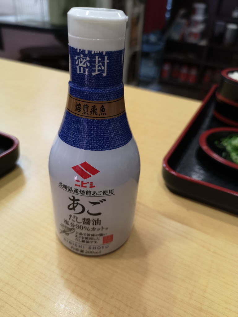 このうどんは、あごだしに入っているのですが、別に生卵がついてきて、そこに、この九州の醤油を入れてかきまぜ、うどんを付けて食べるのだそうです。