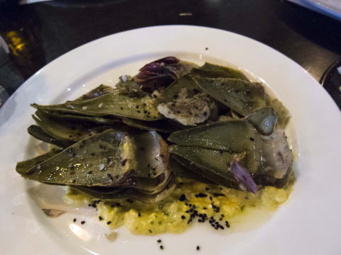 これはアーティチョークの焼いたもの。アーティチョークは初めて食べました。別に美味しいというものでは無いですね。葉っぱの中の柔らかい部分を歯でこそぎ出すようにして食べます。