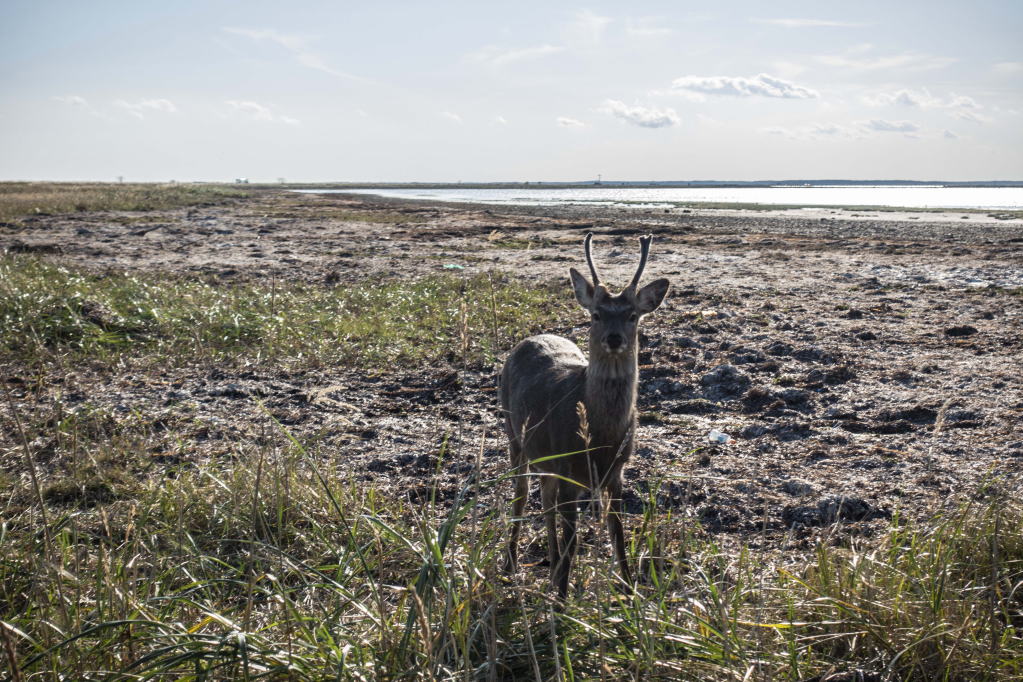 遊歩道を歩き始めたら、鹿に遭遇。海辺で鹿?何を食べて生きているんだろう。