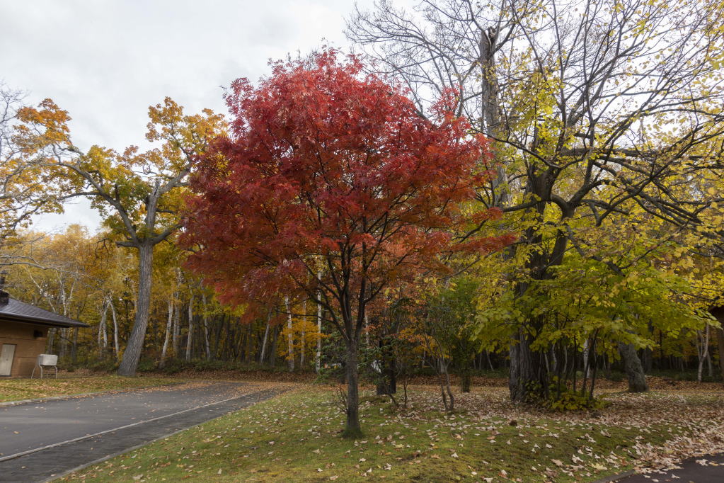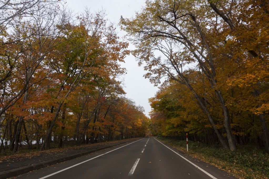川湯温泉を出て、屈斜路湖の周遊路を走っていると、キレイな紅葉の並木があります。