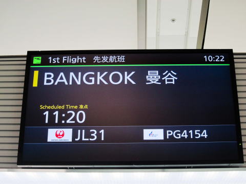 通路側の席も取れず、中央の席へ。まあタイまで6時間弱だから我慢するか。
