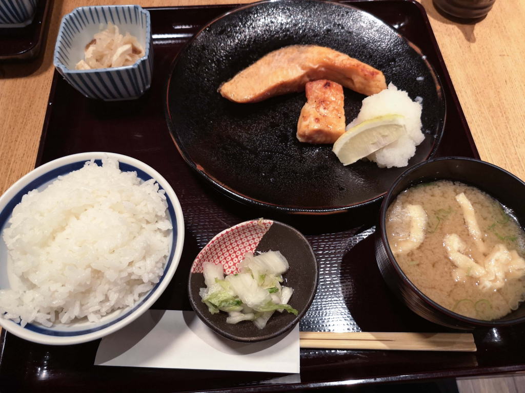 空港では、塩鮭定食。