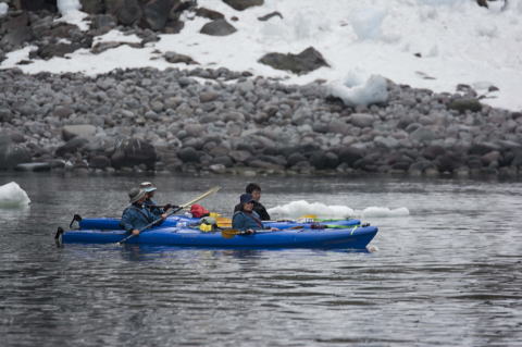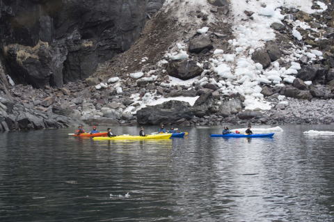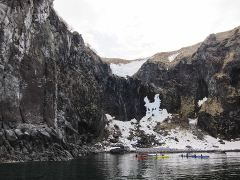 なんと、フレペの滝の下では、シーカヤックの一団が。この寒いのに大変だなあ。