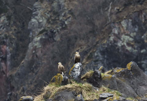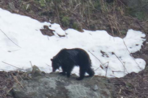 鷹を見て、やはり知床には自然が多いなあ、と関心していると、今度は、岸壁にヒグマを発見。おお、生でヒグマを見られるとは。岸壁まで結構距離があり、望遠でやっと撮りましたが、結構ピンボケ。それでも写真が撮れてラッキーでした。