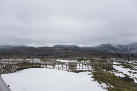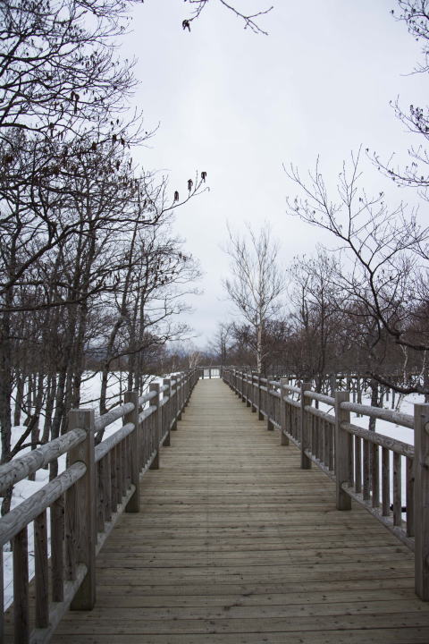 それにしても寒いです。歩くのは、高架になった遊歩道です。この遊歩道の周りには高圧線が張り巡らされており、ヒグマが遊歩道へ登ってくるのを防いでいます。おかげで、安心してあるけるわけです。