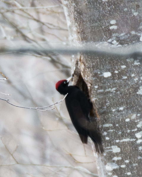 あんまり寒いので、早々に駐車場へ戻ることにしました。そして、元来た道を戻って下山です。すると、下山の途中で、四輪駆動車のサンルーフから体を出し、超望遠レンズ、いわゆるバズーカを構えている人を発見。何を写しているのかと思い、私を車を停めてみると、近くの木にクマゲラが止まって盛んに木をつついているのを発見。早々、私もカメラを抱えて、静かに接近、撮影を試みました。