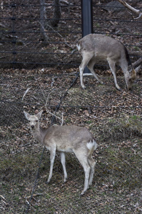さて、さらに下山していきます。すると、今度は道路際の斜面に鹿を発見。それも沢山います。