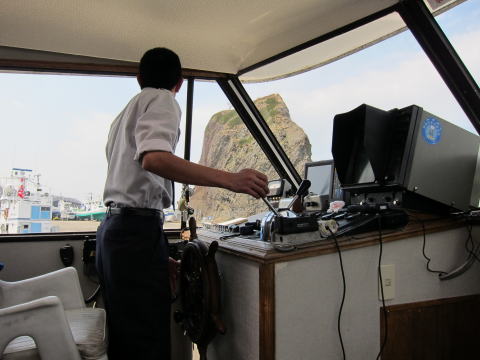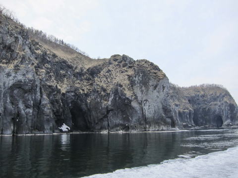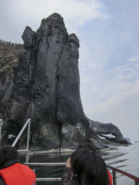 さて、朝食が終わったら、観光船乗り場へ。乗り場までは、ホテルから歩いて行けます。半島の観光船には大型観光船とクルーザーがあり、私は大型観光船のオーロラ号に乗る予定。まずはチケット売り場へ行きました。すると、「予約されていますか?」と聞かれました。それほど観光客もおらず、予約は不要と思っていたのですが、やはり予約が必要だったのか?確認すると、どうやらオーロラ号が釧路での整備から戻っていないという事らしく、船の手配ができていないので、予約者だけを別の船に乗せるらしい。ああ、今日の乗船はあきらめか、と思ったら、「ゴジラ岩の前にあるゴジラ岩観光に行けば、船が出ているかも知れませんよ」と教えてくれた。ならばと思い、ゴジラ岩観光へ。すると、既にお客さんが結構待機している。業者の方に聞くと10時30分の便に乗れるらしい。早速チケットを買って他のお客さんと一緒に待機所で待機。程なくして乗船場所に案内された。付いていくと、なんと、さっき断られたオーロラ号に乗るはずだったお客さんと合流したではないか。なんだ同じ船に乗るのか、だったらさっき断らなくてもいいのに・・・・、と思いつつ船へ。さすがにオーロラ号ほど大きくなく、クルーザの少し大きい程度の船。でも30人くらいは乗れそう。乗船するとすぐに出発です。