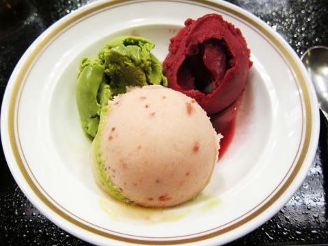 今日のデザートはアイスクリーム。ストロベリー、カシス、抹茶。凄く滑らかなアイスです。