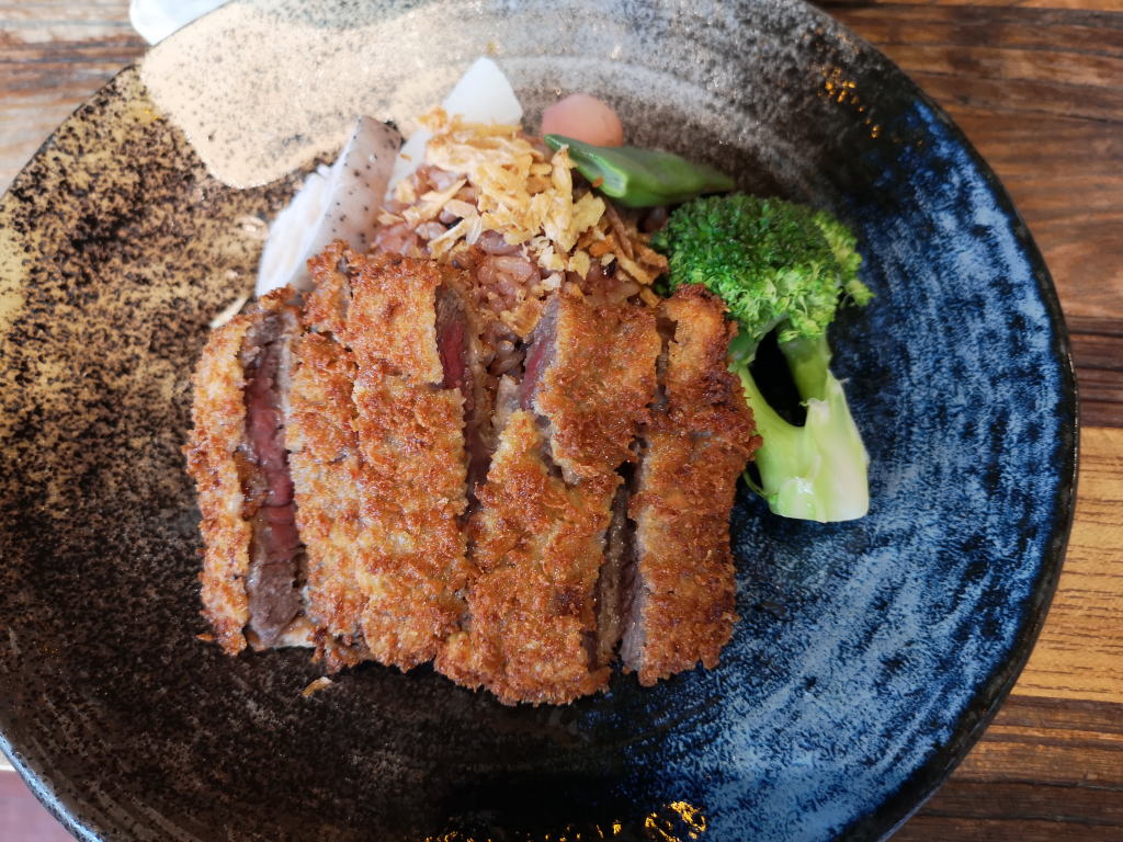 牛かつが美味しそうです。カレールーは2種類あり、塩こうじを使ったものと、タイのグリーンカレーです。