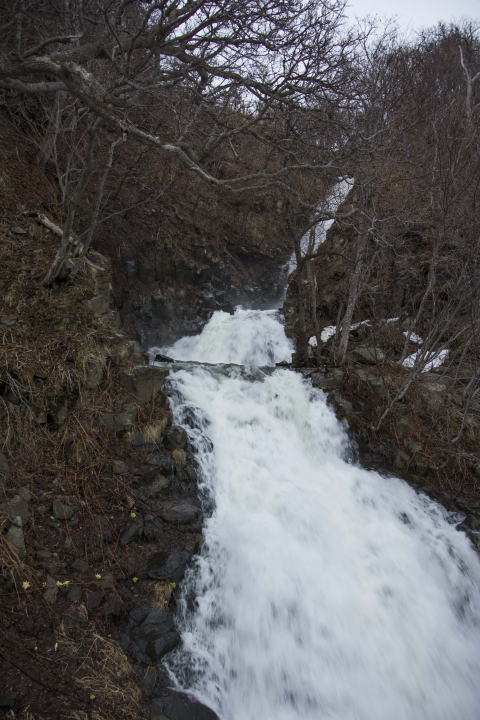 オホーツク海に沿って走って行くと、「三段の滝」という滝を発見。オシンコシンの滝の近くです。でも来る時には気づかなかったなあ。