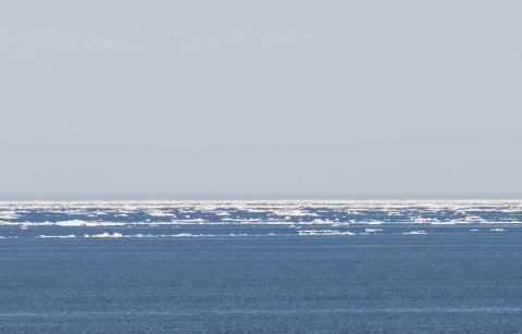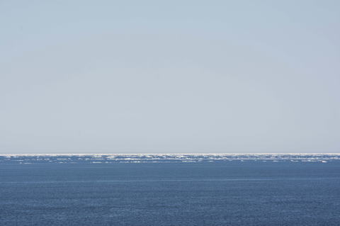 海岸線を進むと、水平線の向こうが何か白く見えます。車を停めて良く見ると、どうやら流氷の様です。望遠で写してみるとやはり流氷でした。この温かさで、沖合いまで流れて行ったのでしょうね。