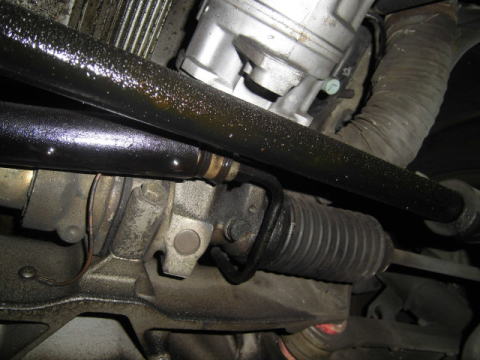 パワステのオイルホース取り付け部からオイル漏れ。これまでハンドルを切るとグーという異音がしていて、パワステのオイルをチェックするとオイルが減っているということがありました。オイルを追加しても暫くするとまた減ってしまう。そのうち家の車庫に入れる際に切り返しをする度にオイル漏れするのか、家の前の道にオイル染みが出来てしまうように。そのため、オイル漏れの根治を行いました。