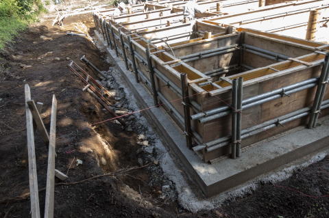 防湿シートの上にコンクリートを流し込んでいる